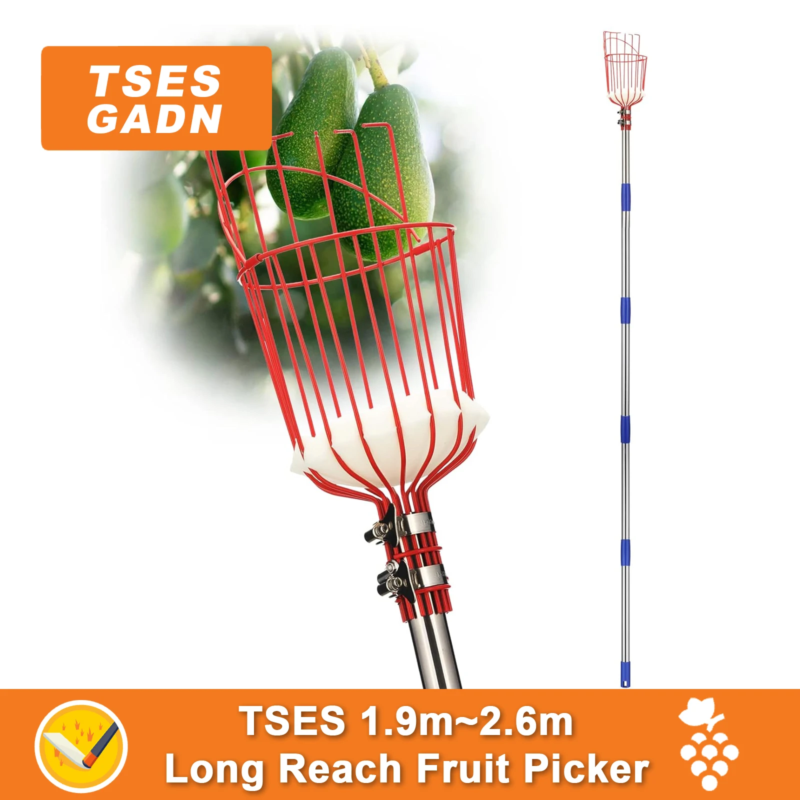 TSES Extendable Fruit Picker Harvester Pole with Basket Adjustable Long Reach Garden Fruit Harvesting Pole Harvesting Tool