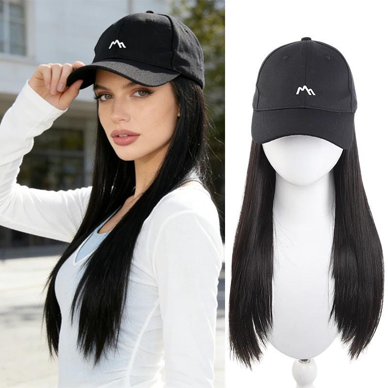 Black Baseball Cap with 3D Mountain Embroidery & Synthetic Fiber Long Straight Wig – Stylish One-Piece Wig Hat for Women, Easy W