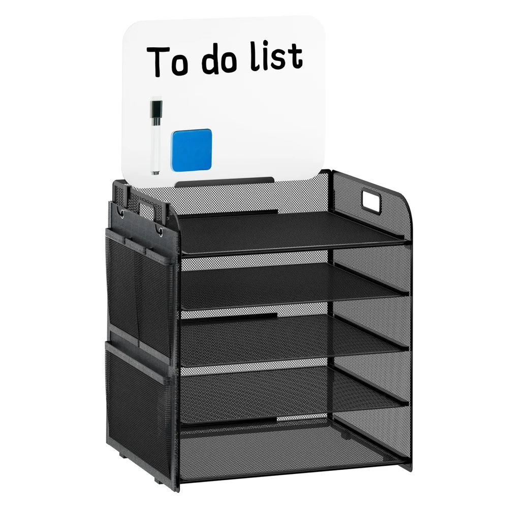 5 Tier Metal Mesh Desk File Organizer with Whiteboard & Storage Pockets, Space-Saving Office Shelf for Books, Stationery