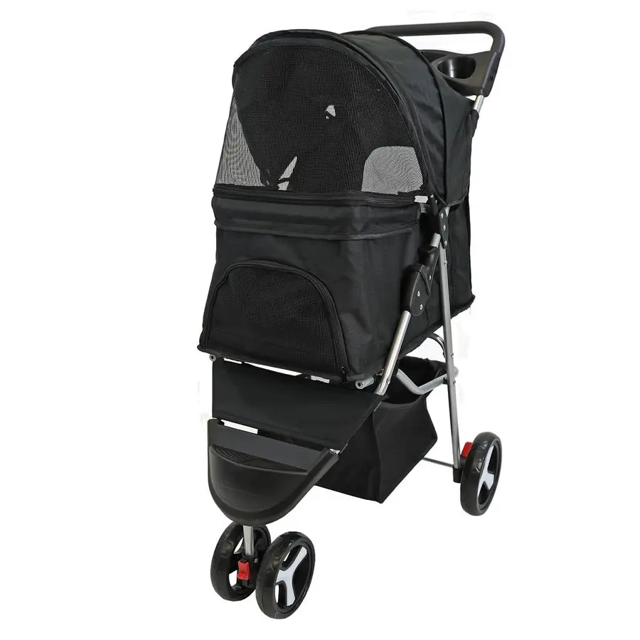 Black Foldable Pet Stroller with Weather Protection and Swivel Wheels 15kg Carrying Capacity