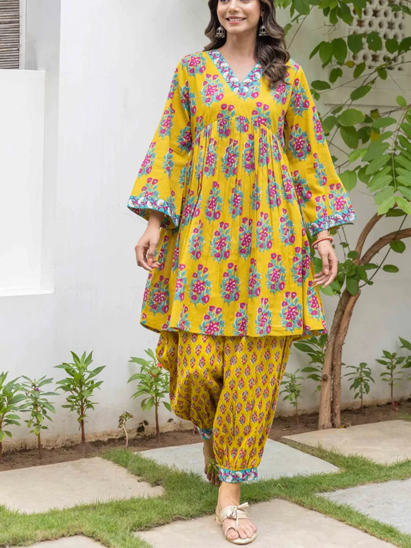 Plus Size Women's Two-Piece Set - Ethnic-inspired print V-neck kurta with bell sleeves, featuring an elastic waistband and flar