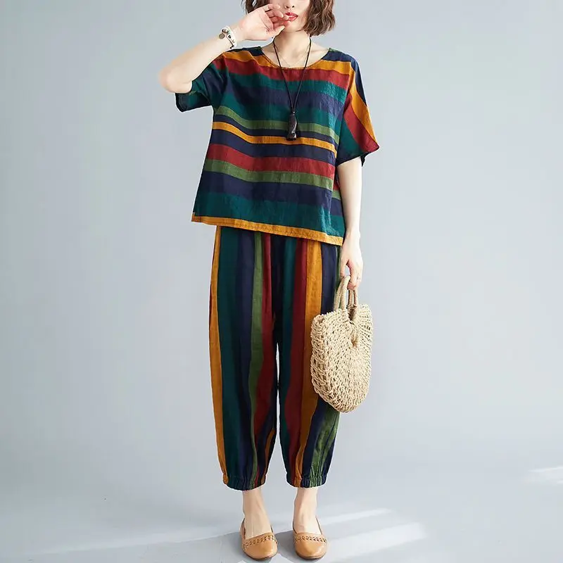 Plus-size Women's Summer Breathable Comfortable Thin Literary Retro Multi-color Striped Loose Short-sleeve Casual Two-piece Set