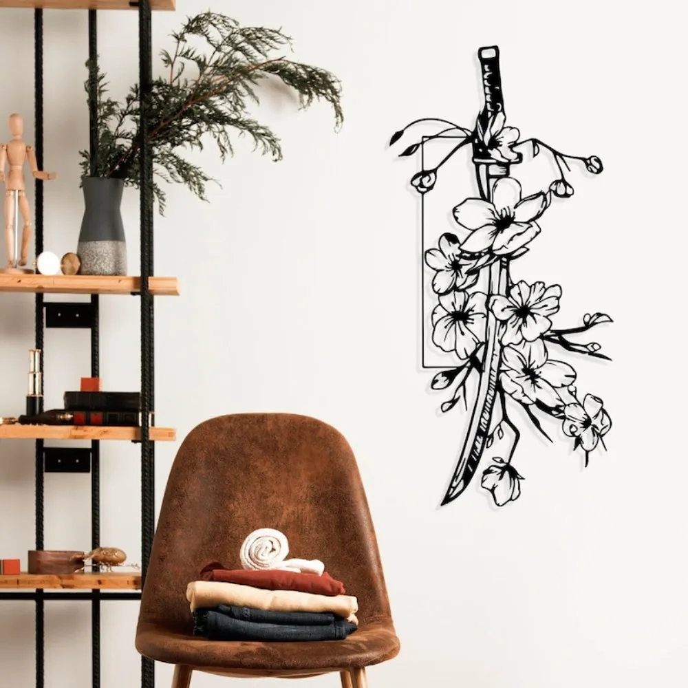 Katana Sakura Metal Wall Art, Japanese Cherry Blossom Design, Unique Home Decor Gift