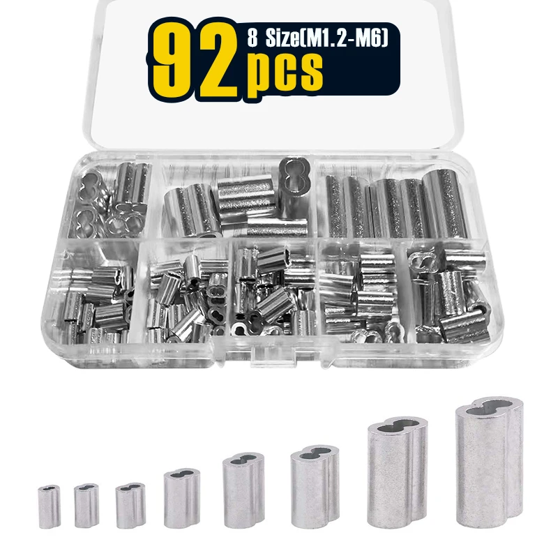 92 Pcs M1.2-6(3/64-1/4'') Aluminum Wire Crimping Loop Sleeve Assortment Kit 8 Size Wire Rope Sleeves Double Barrel Cable Ferrule