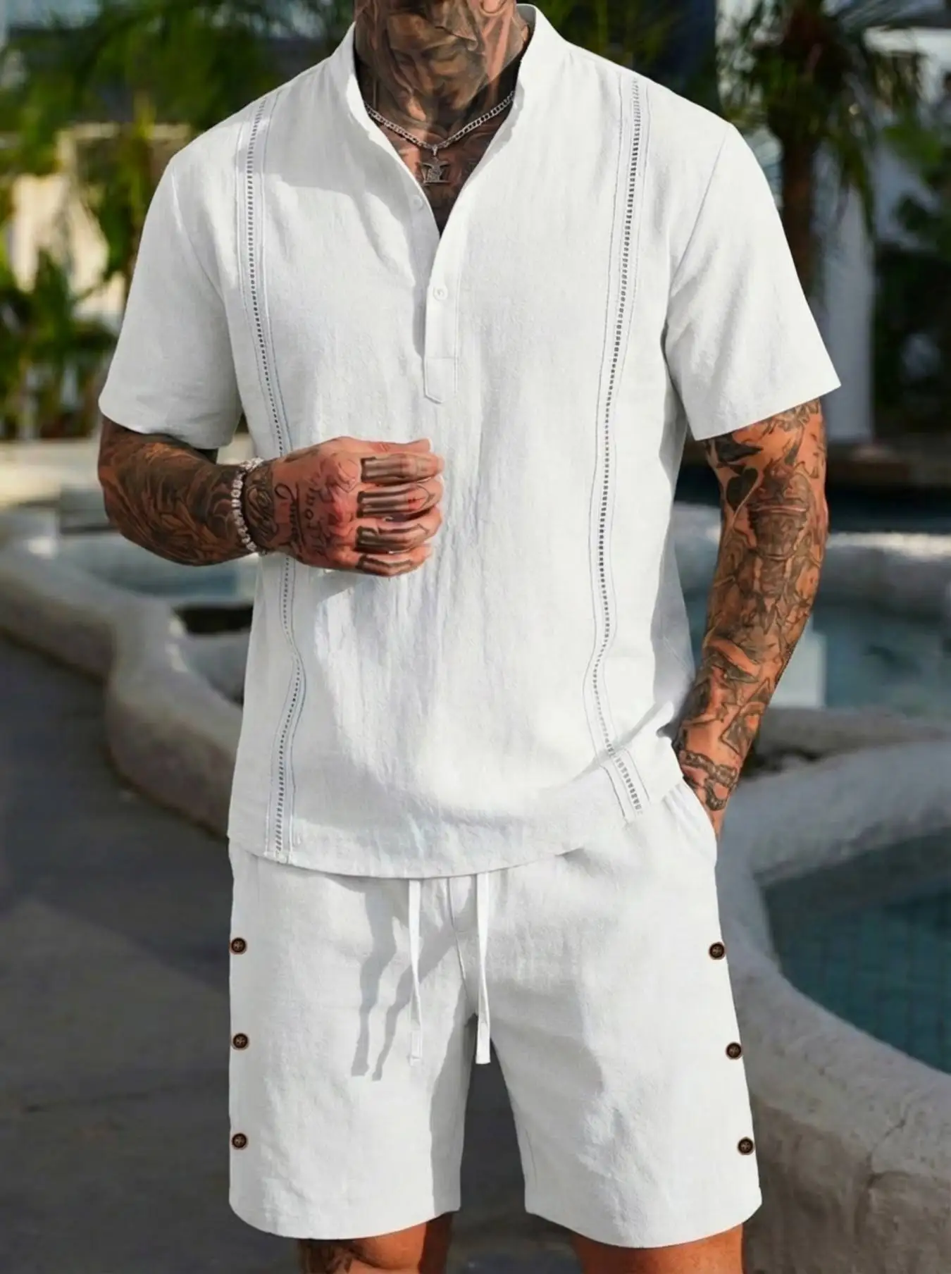 2026 men's summer beach casual Henry collar shirt set Hawaii men's cotton and linen solid color short sleeved shirt+shorts 2-pie