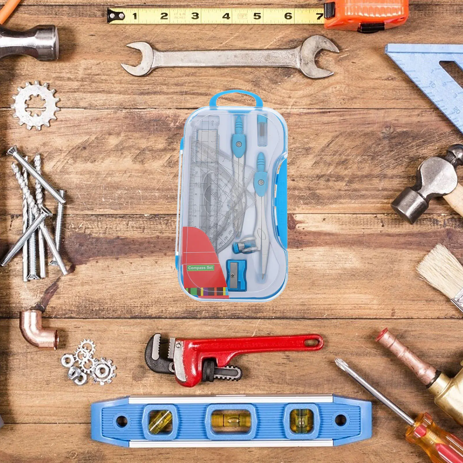 1set Plotter Student Combination Practical Mechanical Construction Engineering Drawing Tool Kit Triangle Ruler Large Compass Set