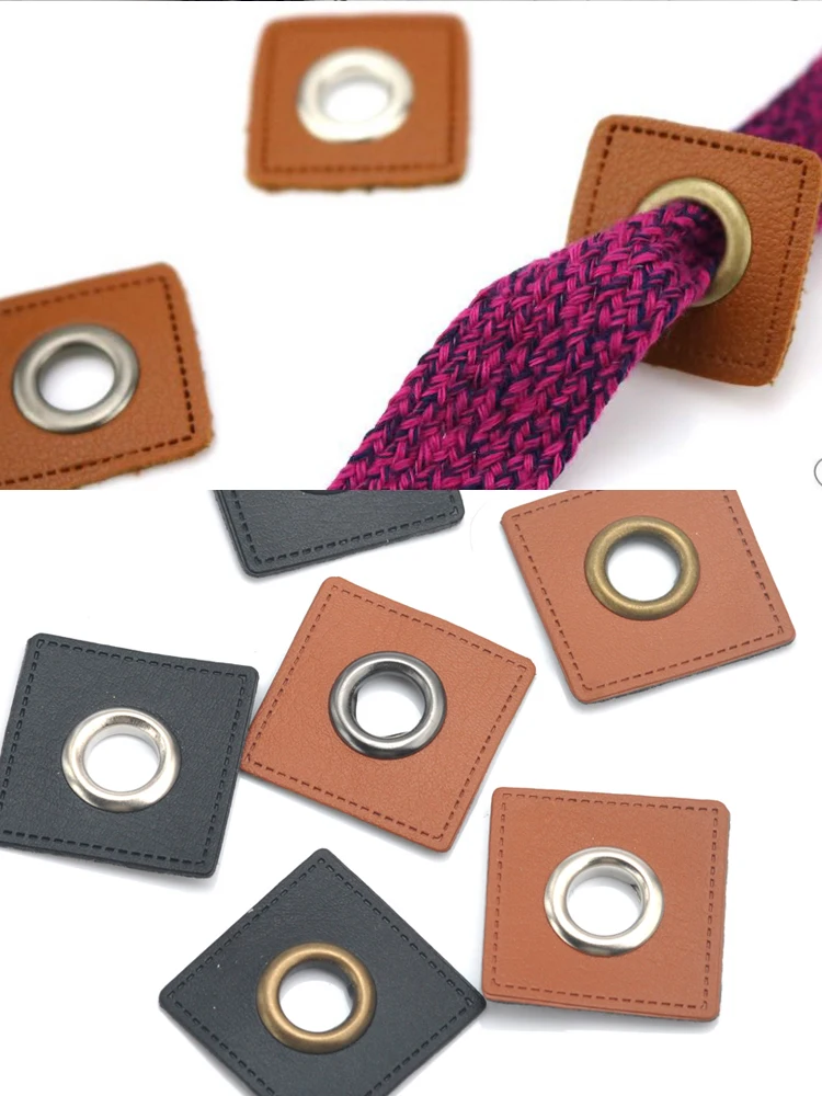 30Pcs/Lot 27/37mm Square Black/Brown PU Leather Sew on Badges Patch Labels inner 8/10/12mm Brass Eyelets Grommets Free Ship