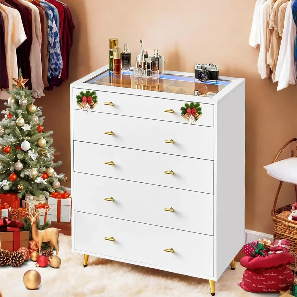 Nordic Minimalist 5 Drawer Dresser for Bedroom Tall, Glass with LED Lights, Wardrobe Closet Island as Jewelry Organize