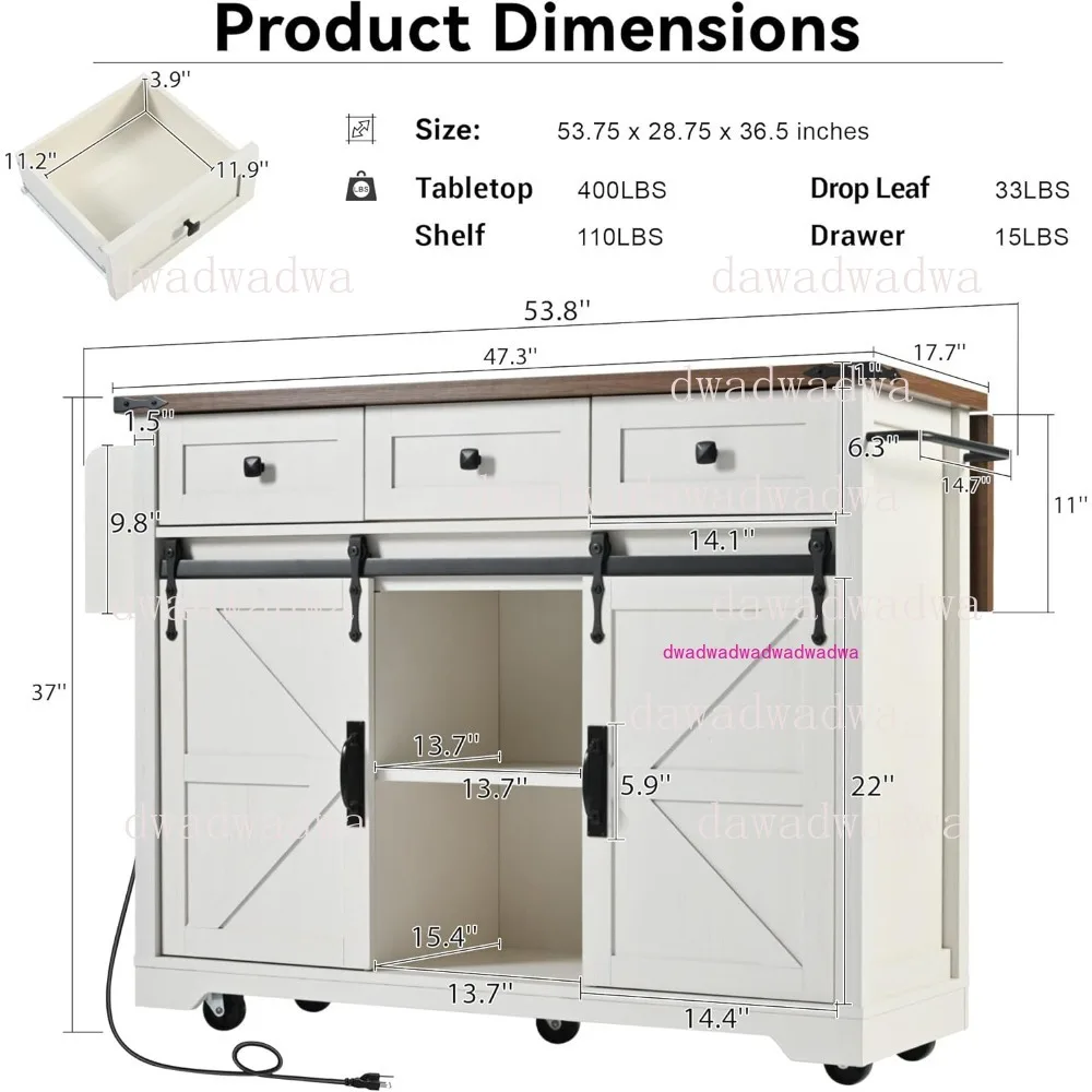 Farmhouse Kitchen Island on Wheels with Drop Leaf & Power Outlet, 53.7-Inch Rolling Storage Island Cart with Drawers