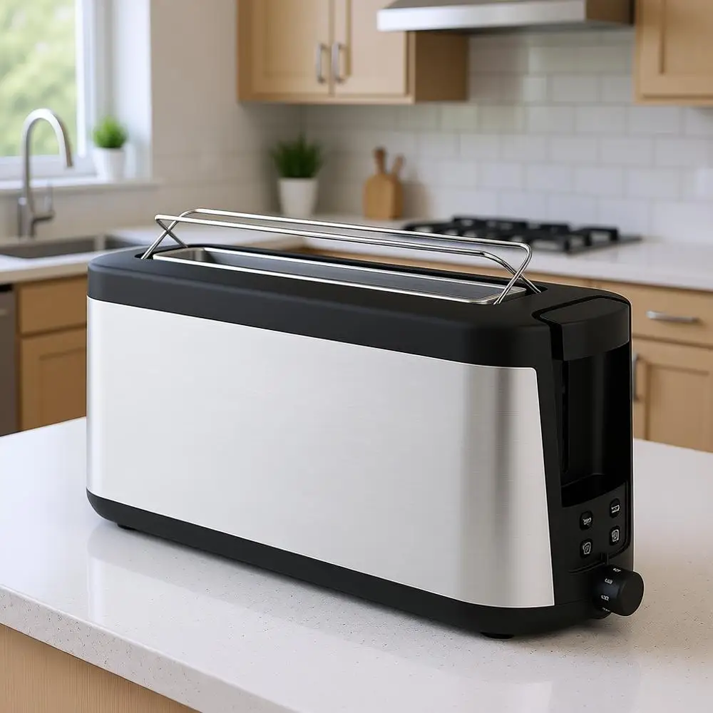 Long Slot Toaster, 7 Gold Levels, 1000 Watts, Integrated Roll, Elegant Design, Black and Stainless Steel