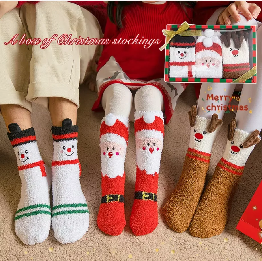 Christmas socks Autumn winter cartoon family Christmas socks gift box with coral velvet socks and velvet warm mid-tube floor soc