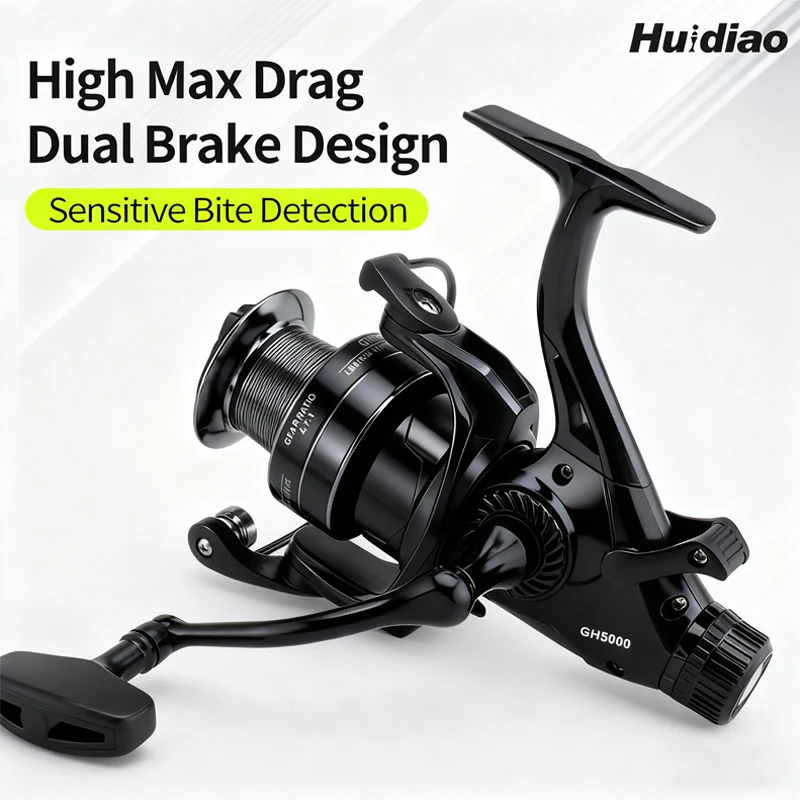 HUIDIAO Front & Rear Brake Spinning Reel 12KG Max Drag 5.2:1 Gear Ratio Daul Brake Fishing Reel Tapered Spool for Long Casting