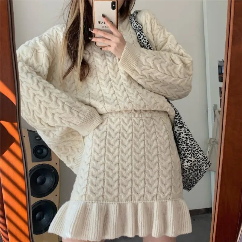 New Style Women's Knitwear Single-piece Set: Retro Loose Twisted Sweater + Short Skirt Two-piece Set for Petite Figures
