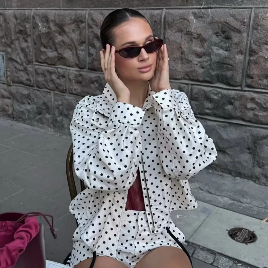 2025 Autumn New Stand Collar Long Sleeve Color-Block Polka Dot Drawstring Jacket and Shorts 2-Piece Set