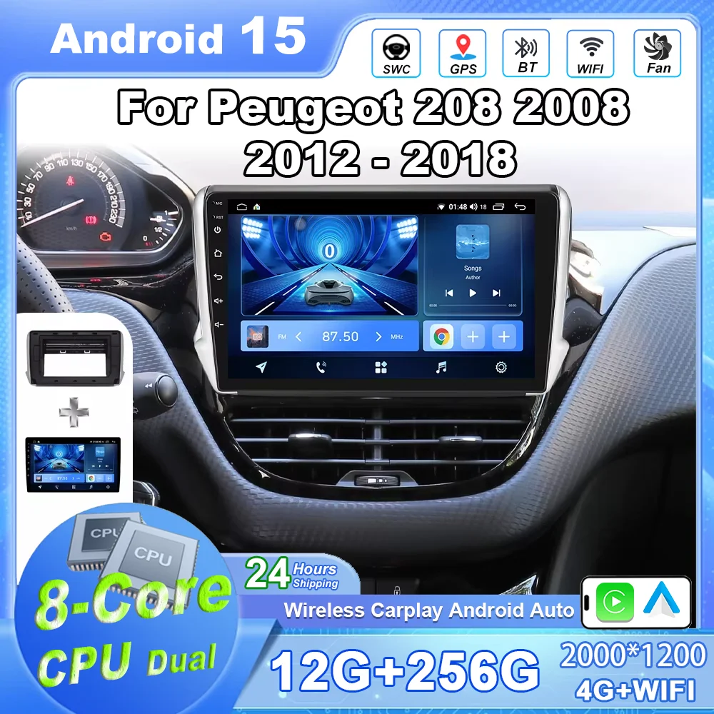Android 15 For Peugeot 208 2008 2012-2018 2K QLED Car Radio Multimedia Video Player GPS Stereo CarPlay 4G+Wifi Head Unit Screen