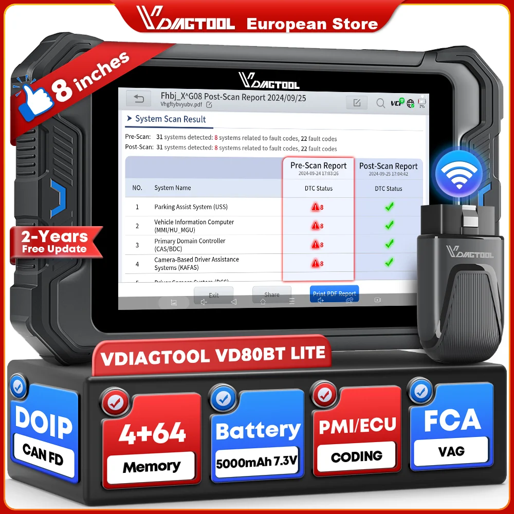 VDIAGTOOL VD80BT LITE Automotive Scanner All Systems Car Diagnostic Tools 28+ Resets FCA DOIP ECU Coding OBD2 Bluetooth Scanner