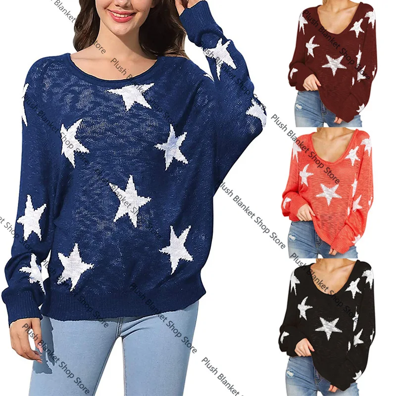 2025 new European and American women's clothing autumn and winter five-pointed star pattern loose V-neck knitted sweater jumper