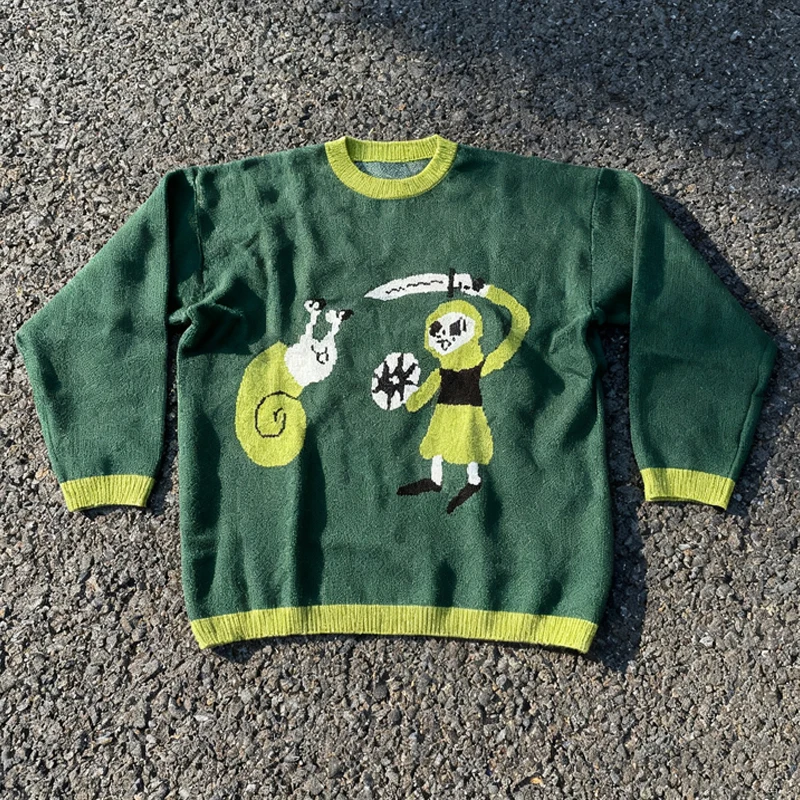 New Anime Autumn/Winter Striped Alien Printed Sweater Women's Loose Round Neck Knitted Hoodie Y2K Aesthetic Casual