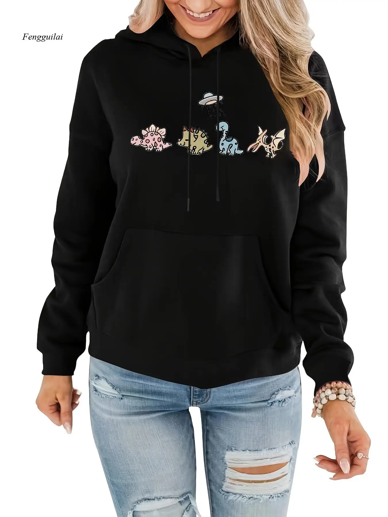Black Hoodie - Cute Dinosaur & UFO Graphic Pullover Sweatshirt, Kangaroo Pocket Hooded Sweater