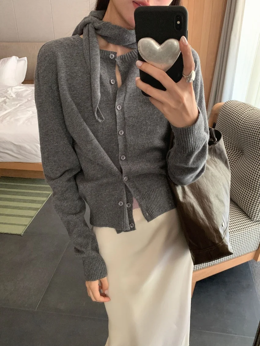 Alien Kitty Retro Solid Slim-Fit Sweaters Women With Scarf Daily New Autumn 2025 Full Sleeve Chic Gentle Camping Office Lady