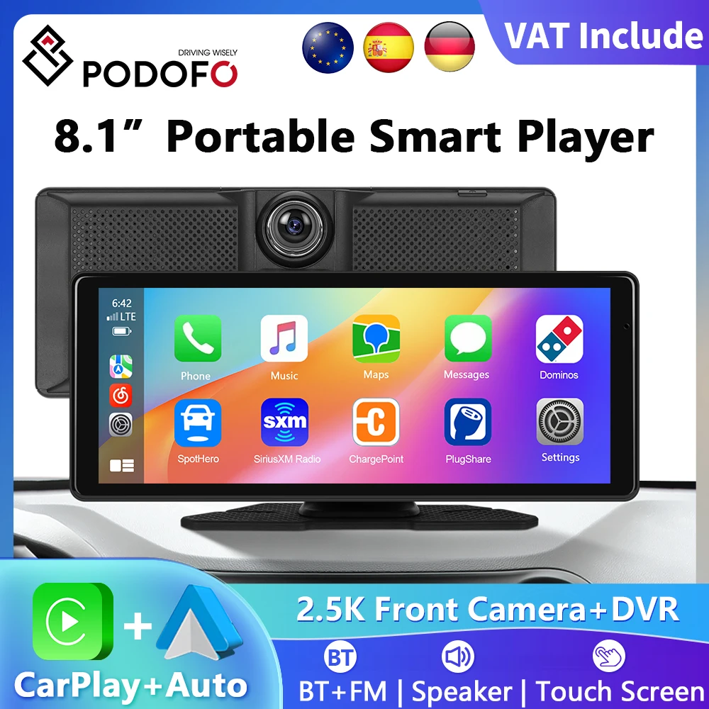 Podofo 8.1'' Portable Smart Player Wireless CarPlay Android Auto With FM Bluetooth 2.5K Front Camera DVR Radio Multimedia Player