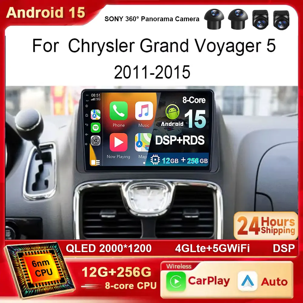 Android 15 For Chrysler Grand Voyager 5 2011 - 2015 For Dodge Grand Caravan 2008-2020 4G WIFI Car Radio Multimedia 360 Camera