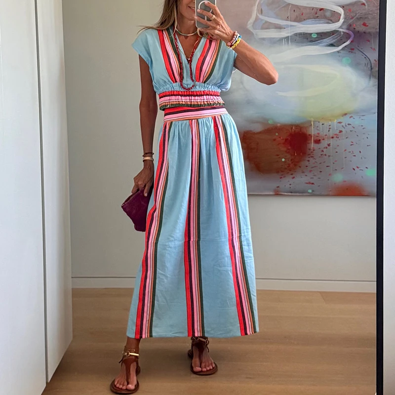 Elegant Color Blocked Beach Two Piece Hawaii Vacation Casual Women Outfits Summer New V-neck Sleeveless Tops&Wide Leg Pants Sets