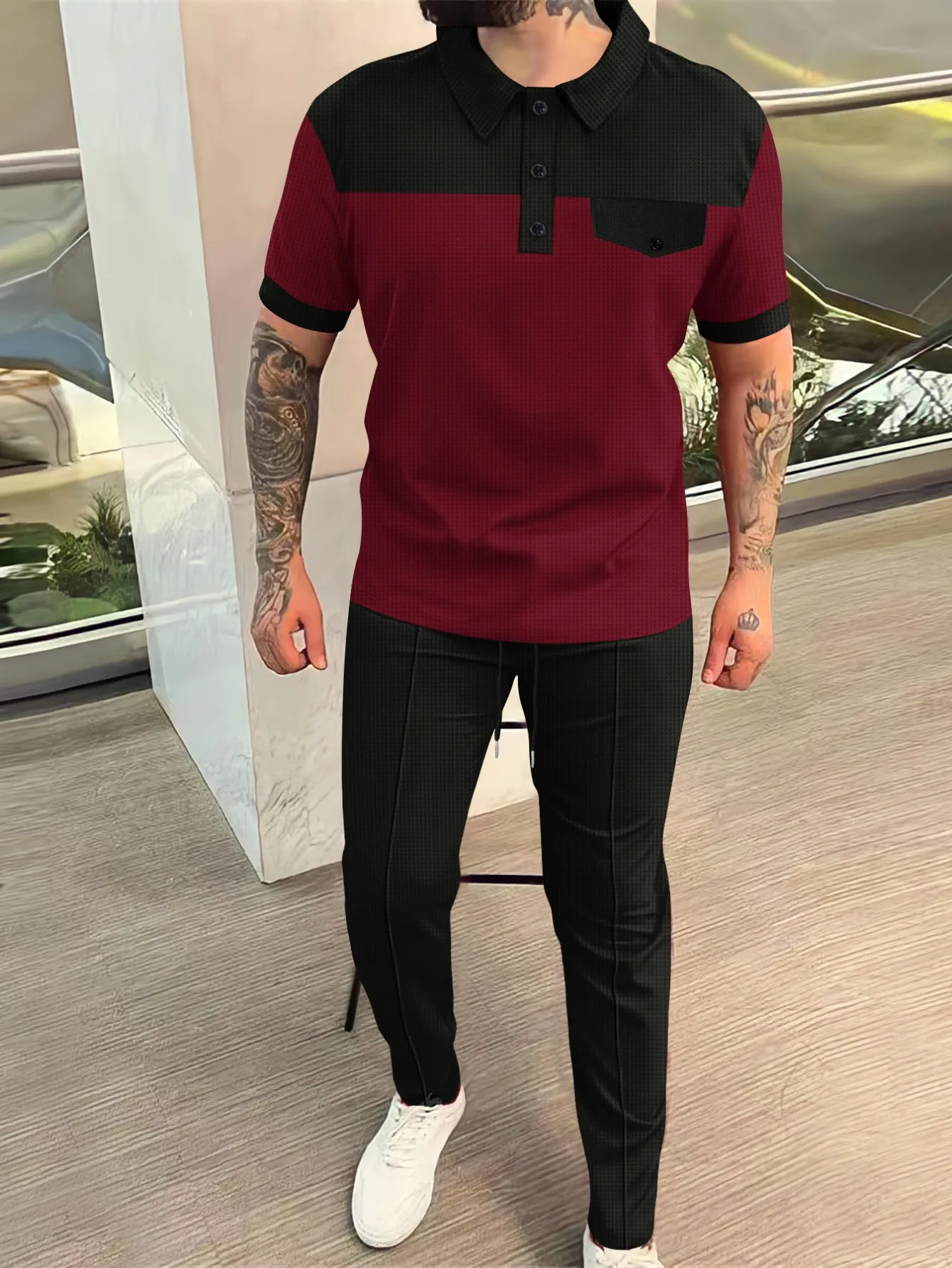 2026 Men's Spring Autumn Business Casual Waffle Knit 2 Piece Set Color Block Polo Shirt & Drawstring Pants
