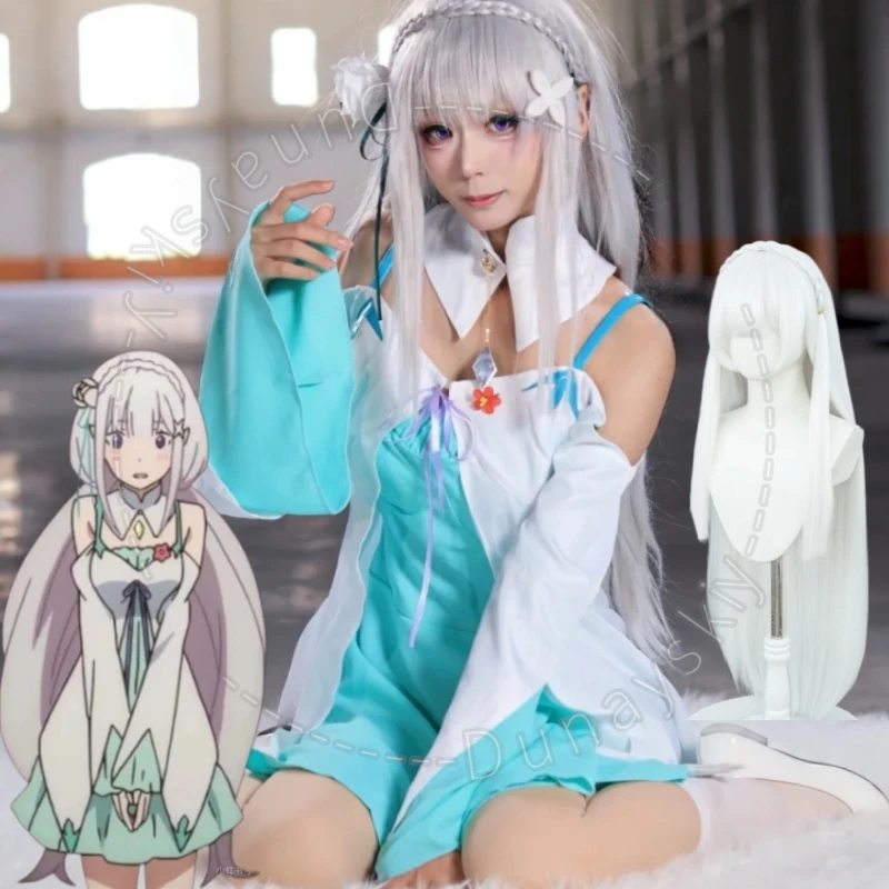Anime Re:Life Emilia Green White Color Block Dress Cosplay Costume Wig Headgear Off-Shoulder Flare Sleeve Design High Collar Cos