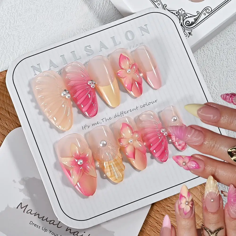 24Pc Short Almond French Press On Nail 3D Blush Flower Pearl Fake Nails Sweet Craving Floral Wearable Full Cover False Fingertip