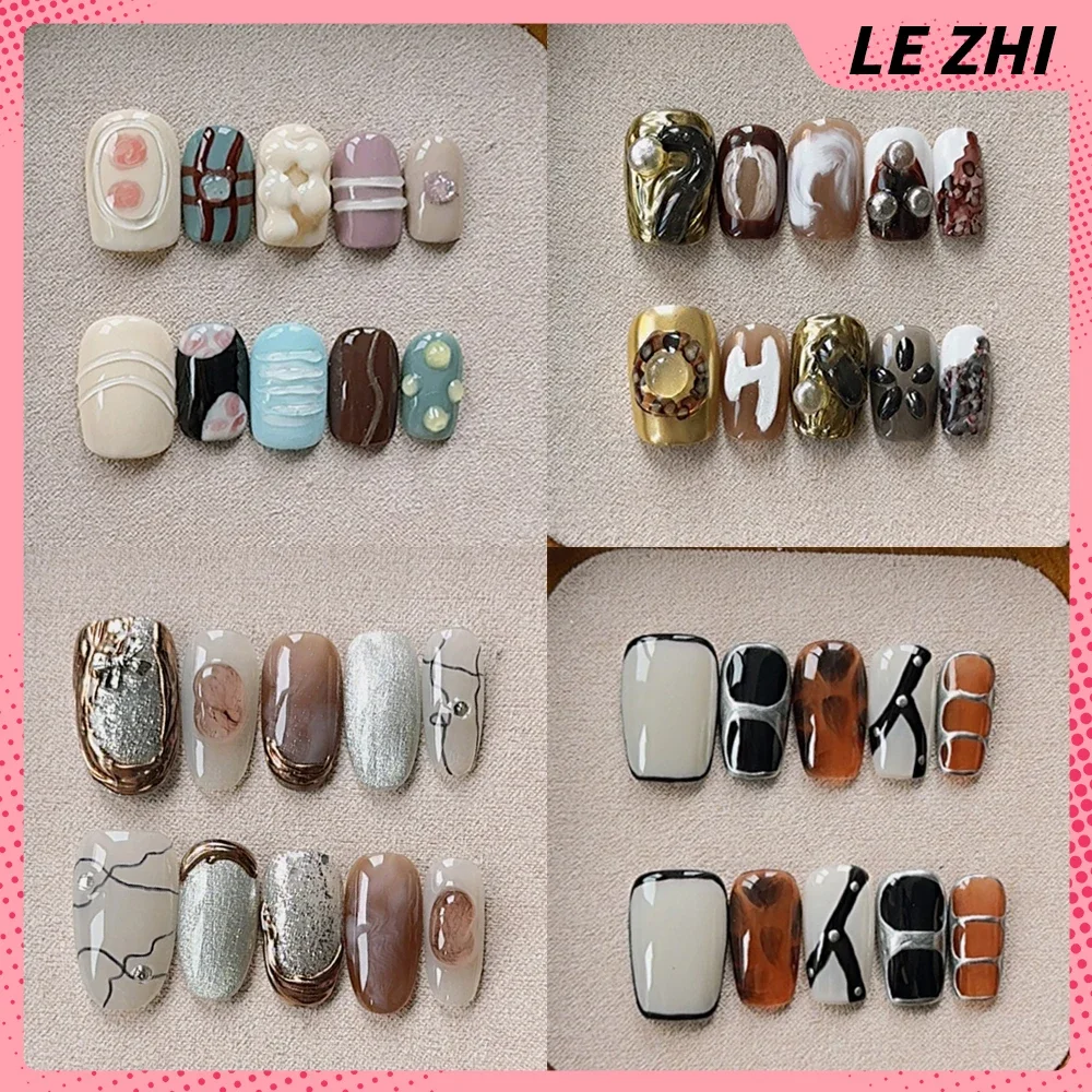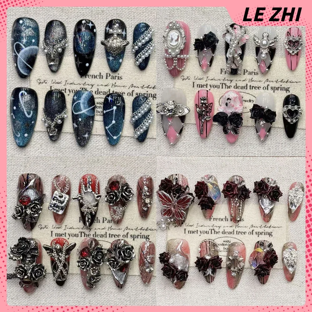 30pcs Long Almond False Nails French Cat Eye Gradient Line Press on Nails Love Heart Cherry Sparkling Pearl Fake Nials DIY