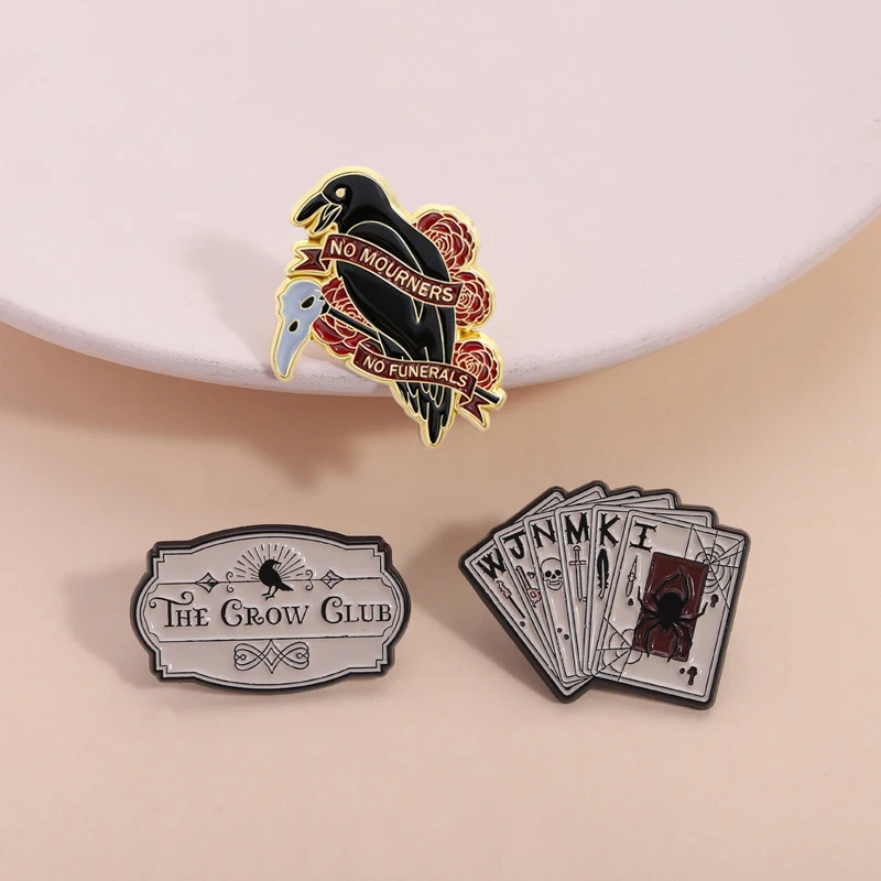 Six of Crows Book Pins No Mourners Quote Poker Design Crow Club Logo Dark Aesthetic Brooches for Grishaverse Fans