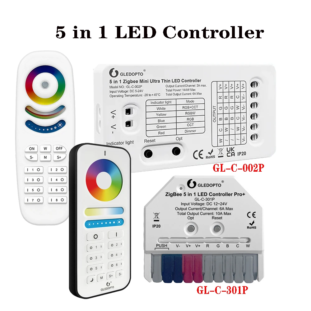 GLEDOPTO ZigBee 3.0 Pro+ 5 in 1 LED Strip Controller 20A Max RGBCCT/RGBW/RGB/CCT/Dimmer Alexa Homey APP Voice Control