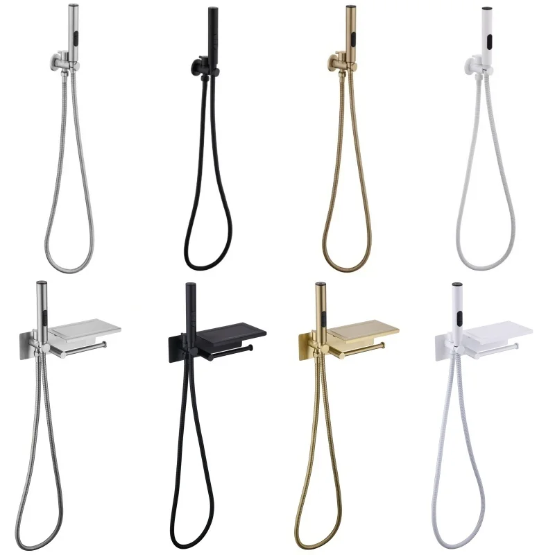 Pulverizador de 3 funciones de bidé cepillado de alta calidad, válvula de latón con botón oculto y estante de productos básicos, soporte de papel, pulverizador de plástico