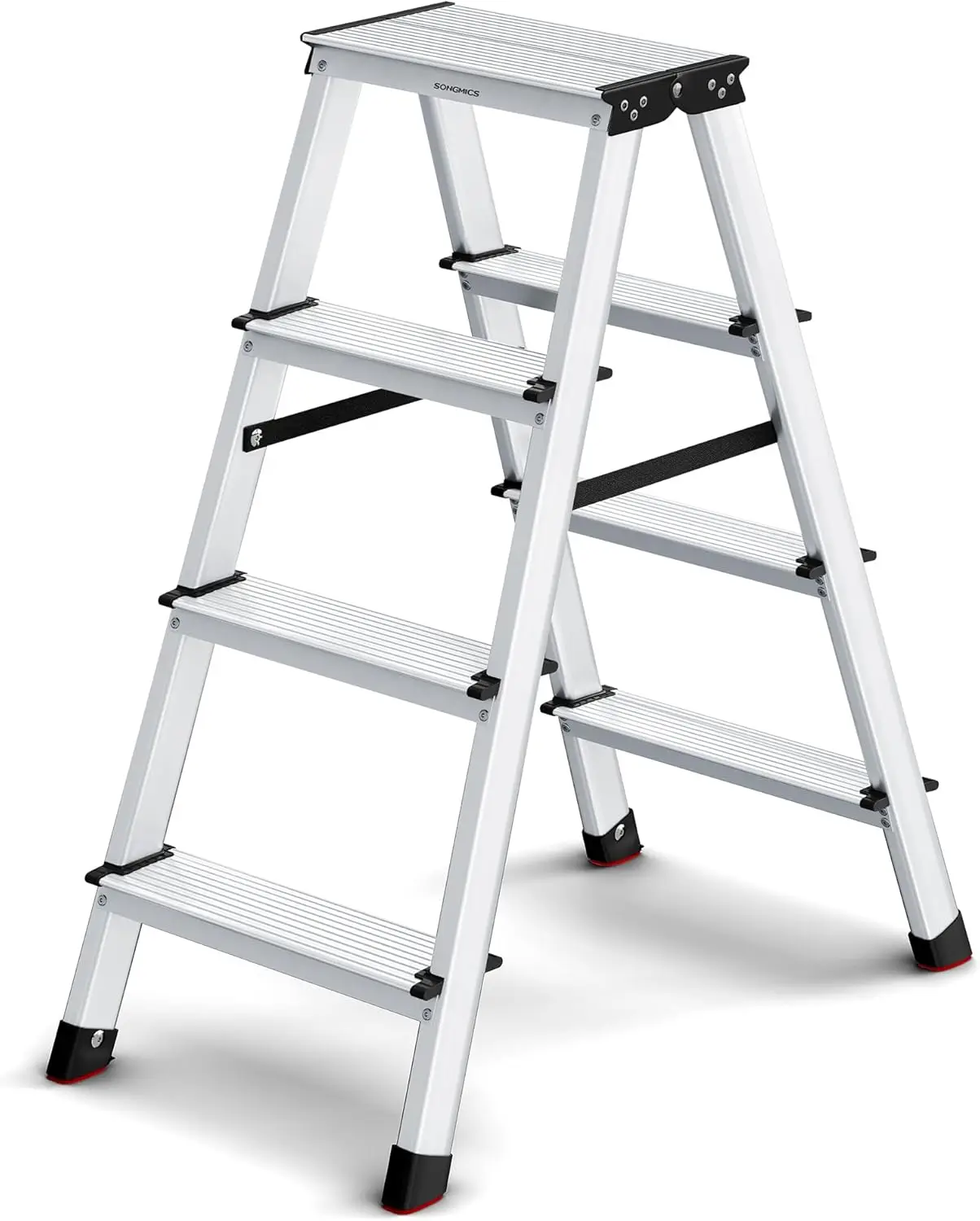 GLT014E01 Escalera plegable, escalera de aluminio de 4 escalones, capacidad de 150 kg, gris plateado y negro