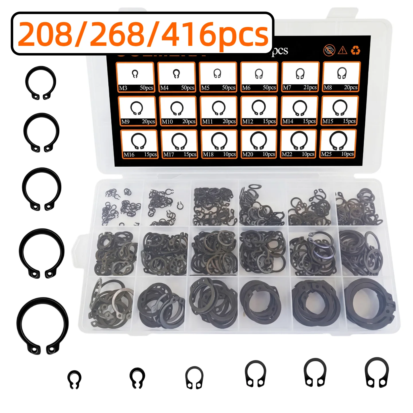 Kit de Anillos de Retención Externos Tipo C, 208/268/416 Piezas, M3-M25, Acero al Carbono, para Ejes, Rodamientos y Herrajes