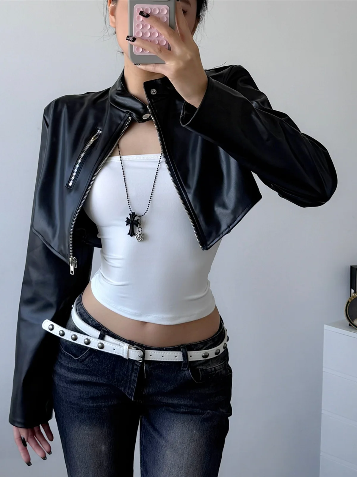 Chaqueta de motociclista con Top corto para mujer, chaqueta elástica de piel sintética con cremallera, estilo Retro Punk, abrigo para el vientre, calle vanguardista, 2025