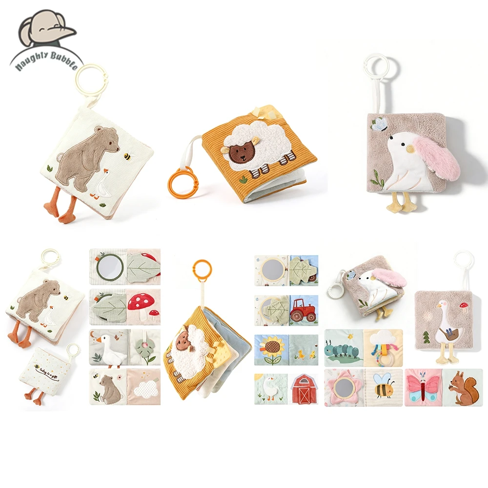 Libro de tela para bebés con oso y ganso, libro sensorial con sonido crujiente, espejo, mordedor y anillo para colgar, juguetes educativos tempranos