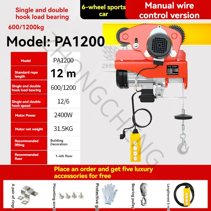 PA1500 1t polipasto pequeño calabaza eléctrica en miniatura grúa doméstica de 220v con coche deportivo de 6 ruedas grúa 1t
