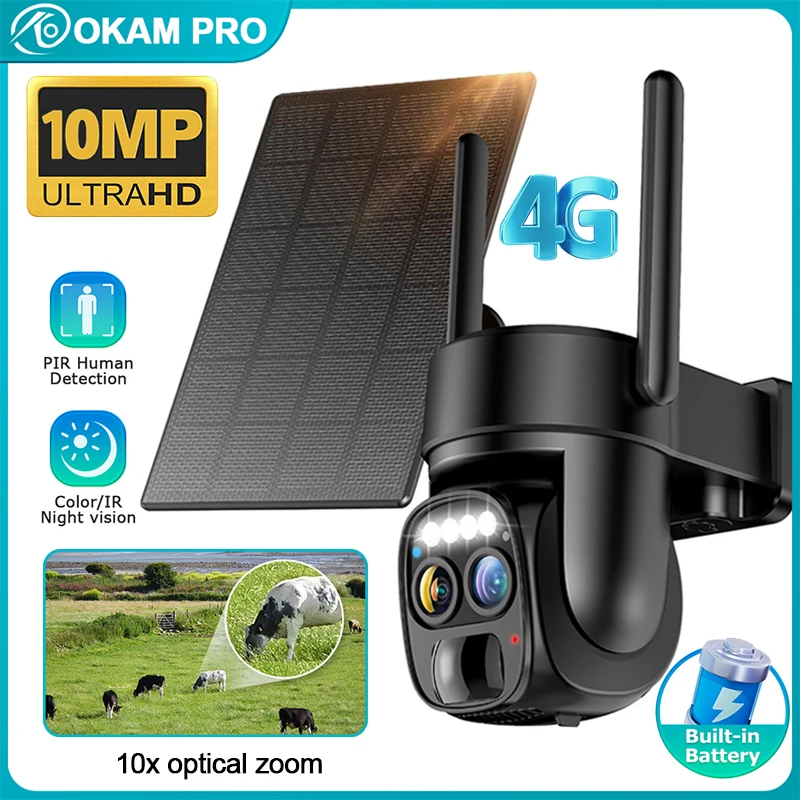 Cámara Solar con Zoom 10x 4G SIM para exteriores, 6K, 12MP, tres lentes, HD, visión nocturna, cámara de vigilancia IP, protección de seguridad, cámara CCTV PTZ