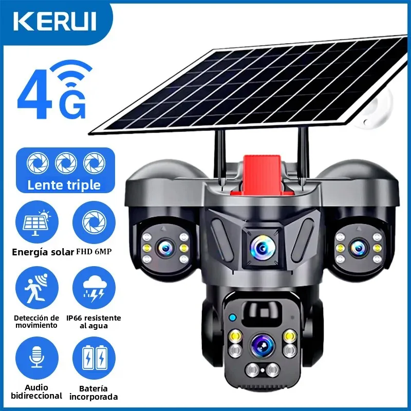 KERUI-cámara PTZ para exteriores, 6MP, 4G, SIM, WIFI, Panel Solar, Triple lente, seguridad para el hogar, vídeo CCTV, vigilancia, batería integrada V380pro