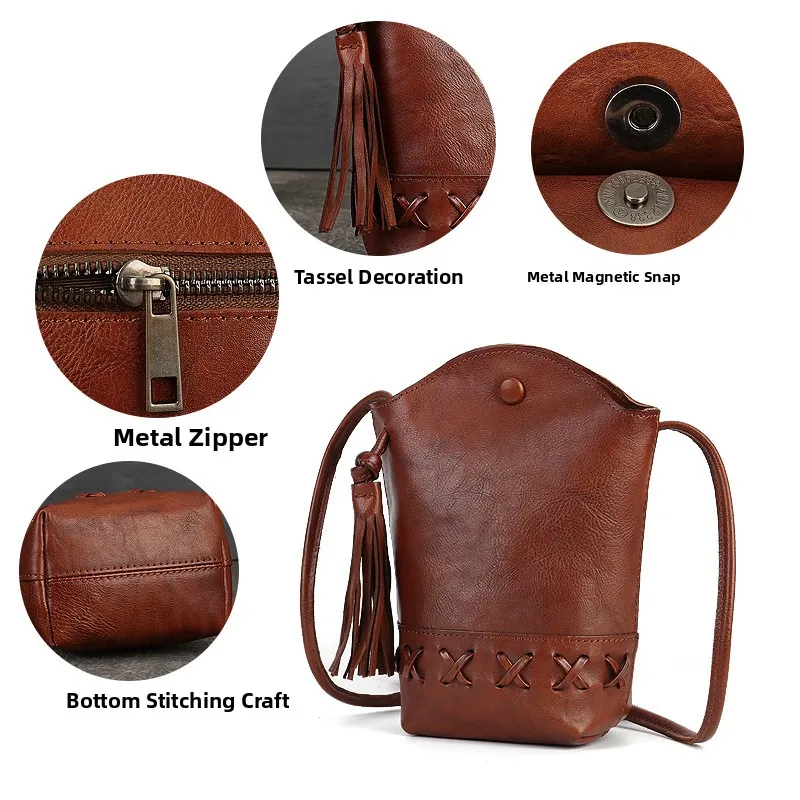 Bolso de Hombro de Cuero Vac de Primera Capa, Estilo Retro, Tejido, para Teléfono Móvil, con Borla, Informal, para Uso Diario