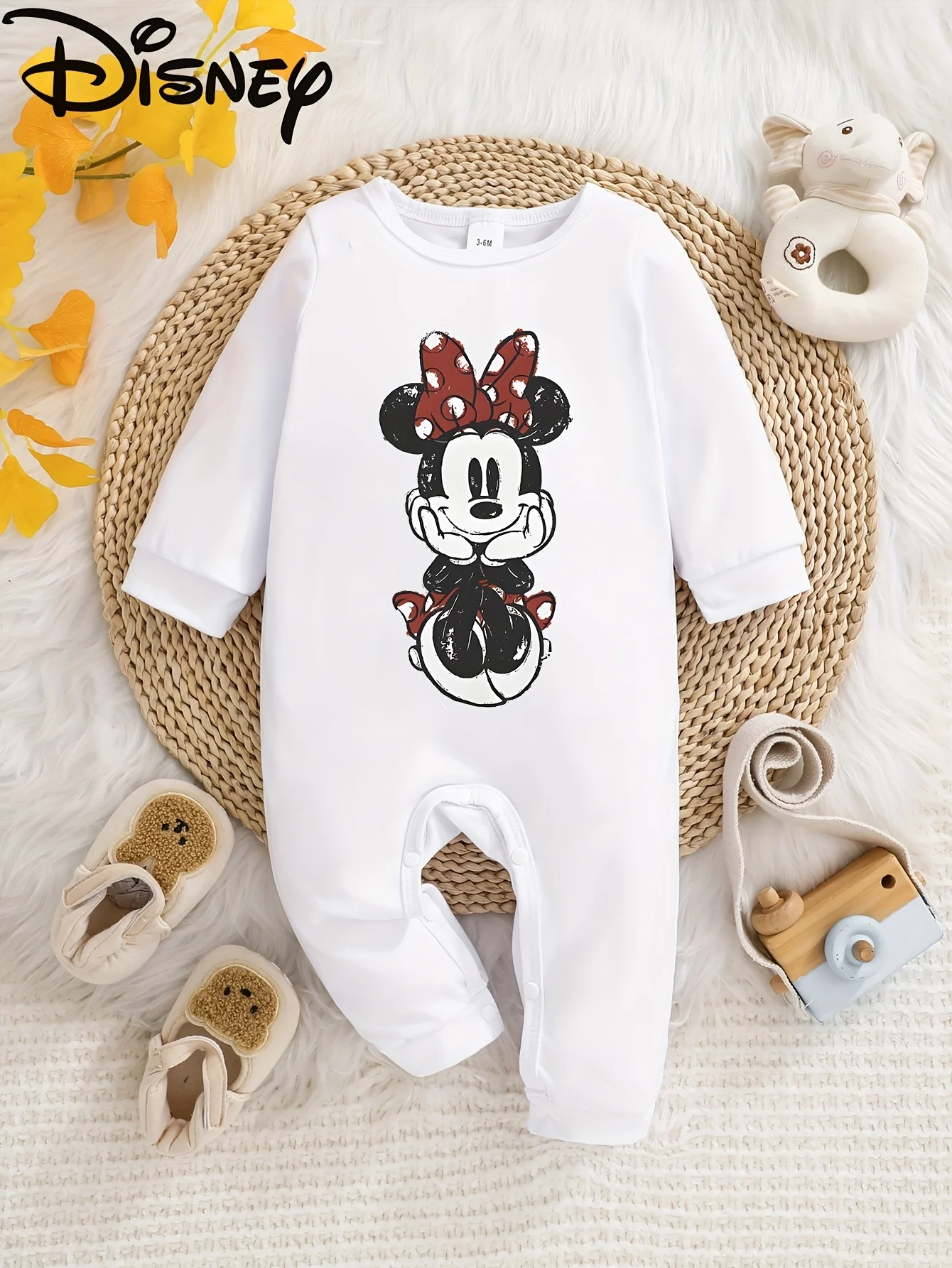 【Autorizado】 Mameluco de manga larga para bebé Disney Minnie Mouse, estampado lindo, cuello redondo, suave y cómodo, lavable a máquina, adecuado para todas las estaciones, adecuado para uso al aire libre