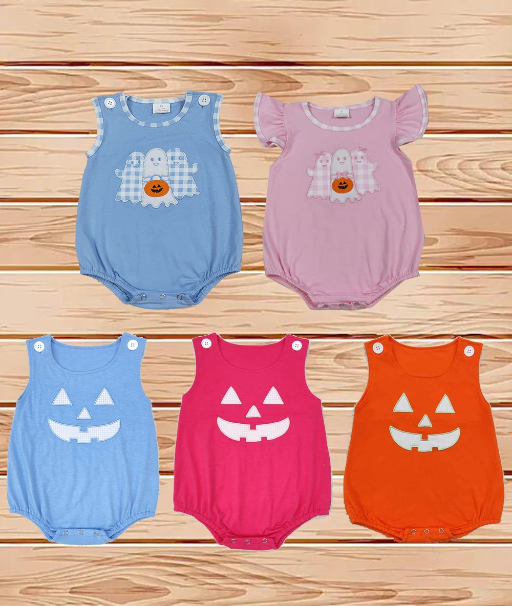 Otoño niños venta al por mayor boutique ropa para niños recién nacidos niño bordado bebé niños fantasma azul calabazas mamelucos de Halloween