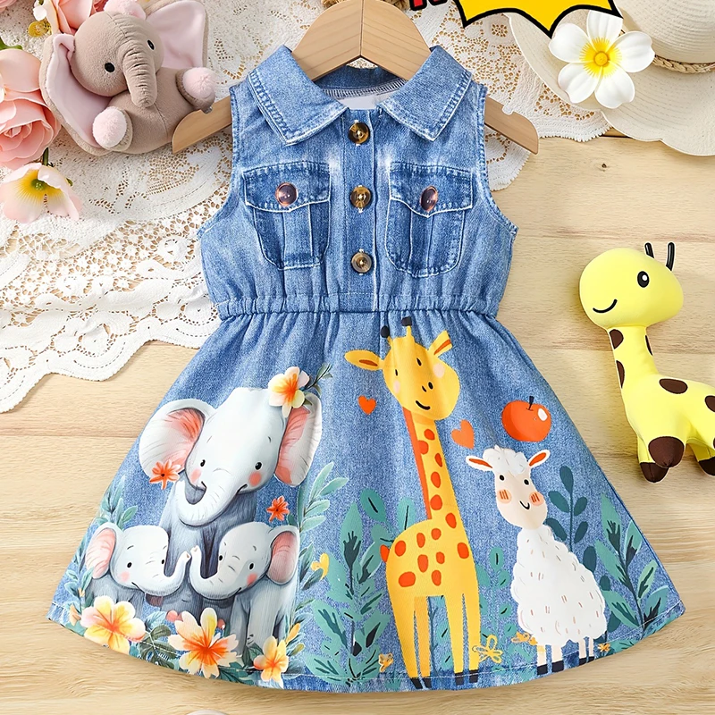 Vestido de fiesta con estampado de dibujos animados y cuello vuelto de mezclilla sintética para niñas, elegante y lindo, ideal como regalo.
