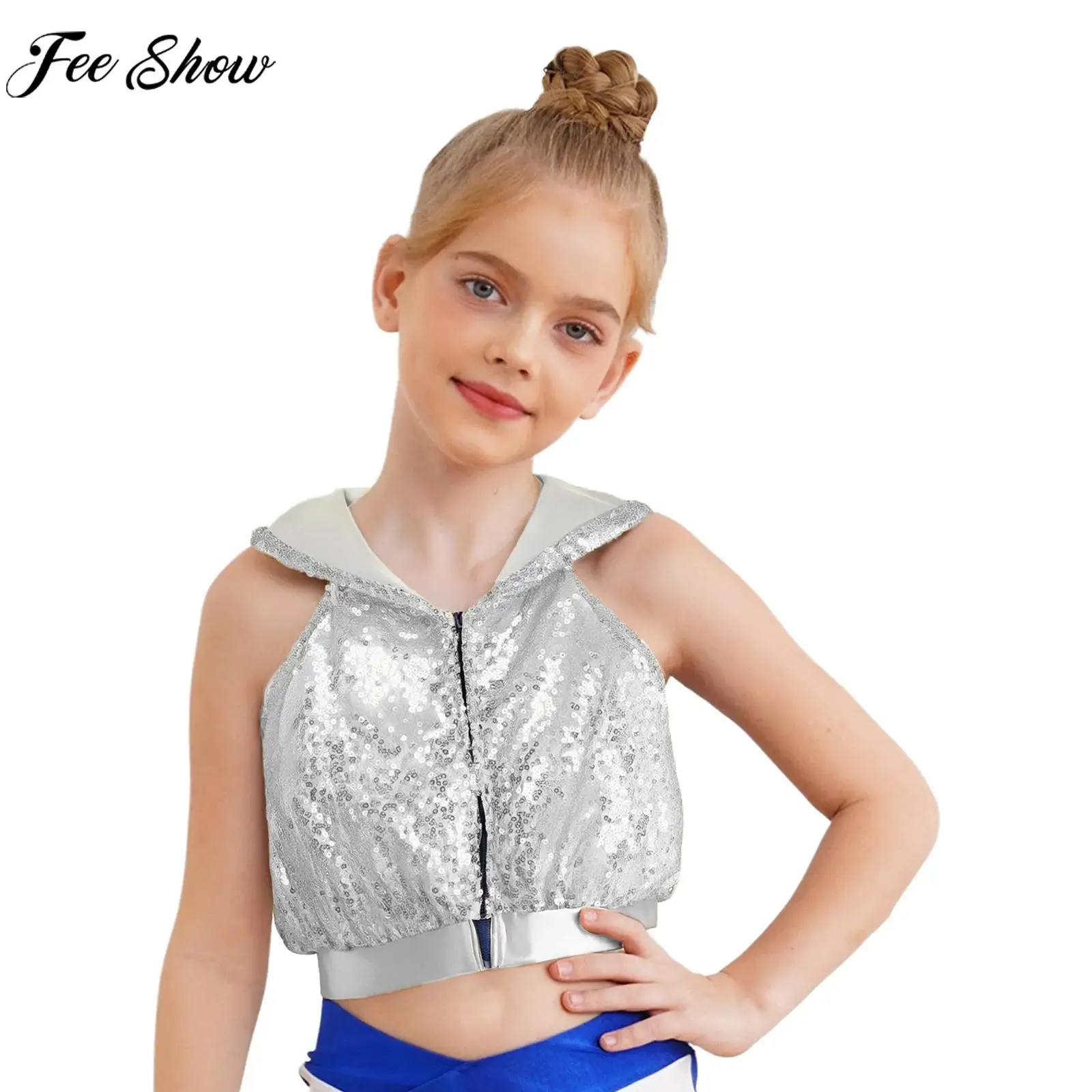 Niños Niñas moda Hip Hop Jazz traje de baile callejero Ropa de baile sin mangas espalda descubierta cremallera lentejuelas brillantes chaleco con capucha Top corto
