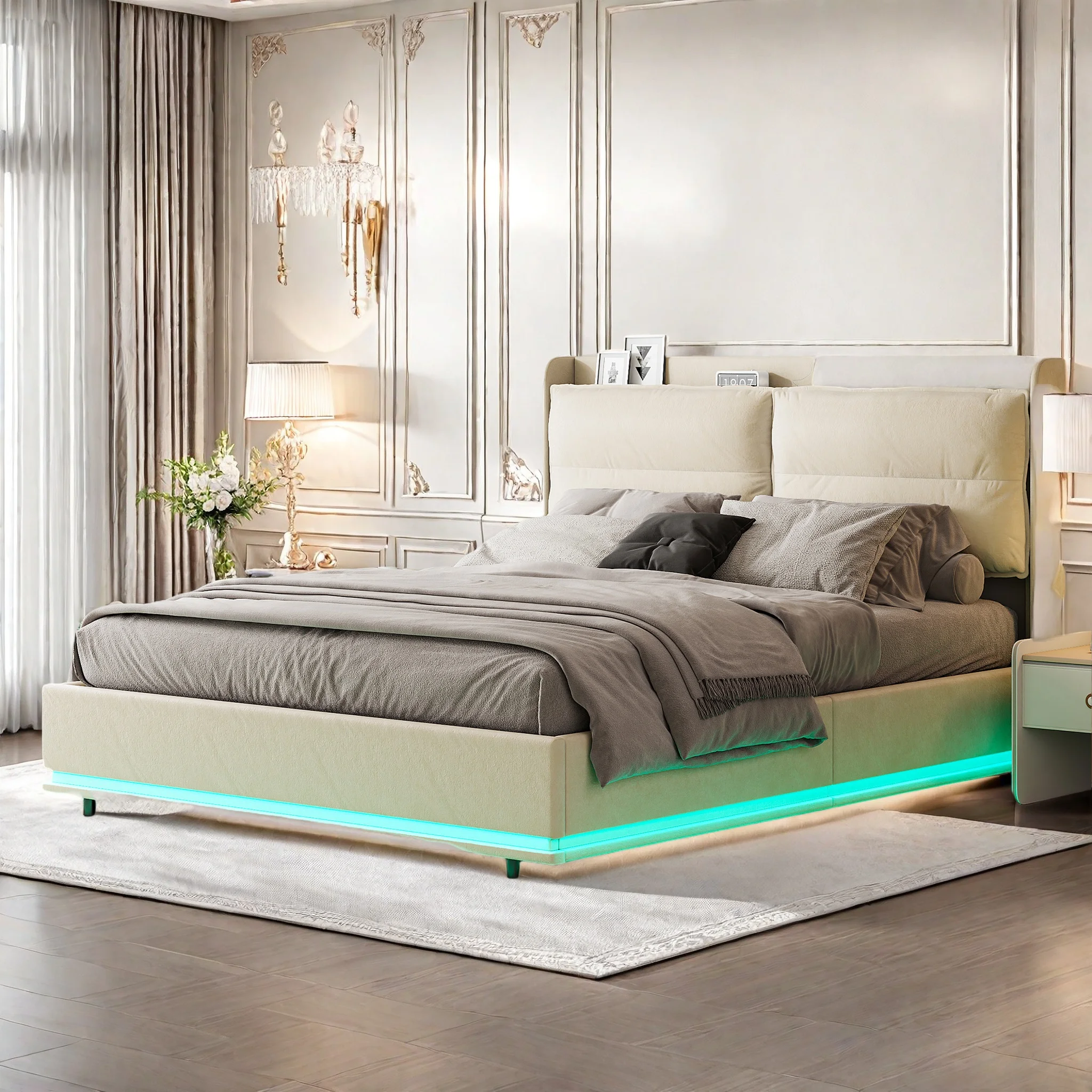 Estructura de cama tapizada 160x200 cm con somier de láminas, LED y puertos USB, cama con almacenaje hidráulico, respaldo con cremallera, terciopelo, beige