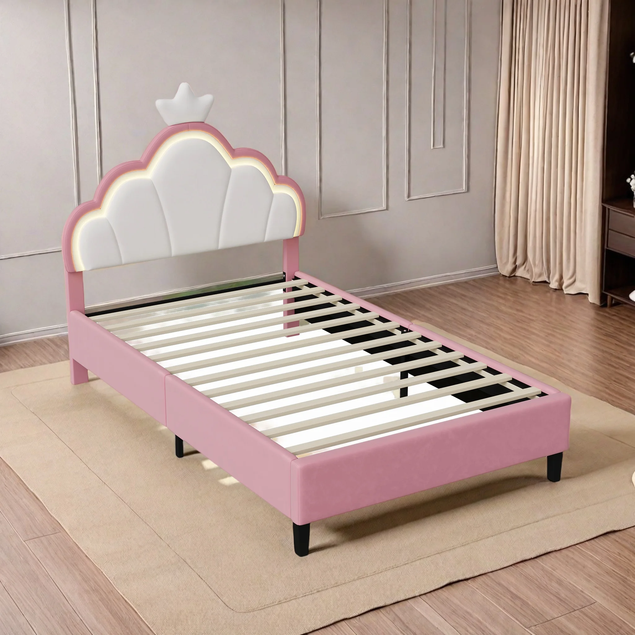 Superaly Cama infantil de 90/140x200 cm, cama de princesa con corona de cuero sintético y tira de luces LED, cama tapizada plana, estructura de cama individual/doble