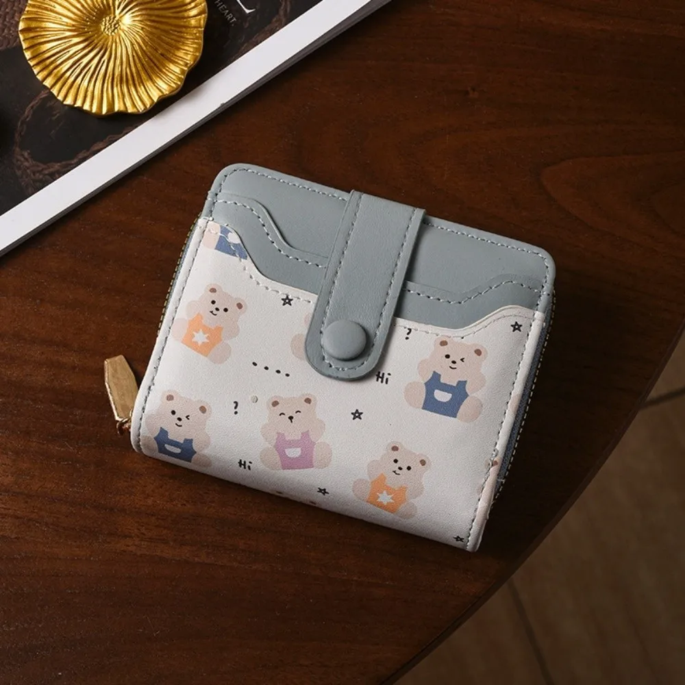 Bonita cartera corta de cuero PU con diseño de oso, tarjetero con botón a presión, múltiples ranuras para tarjetas, monedero para niñas