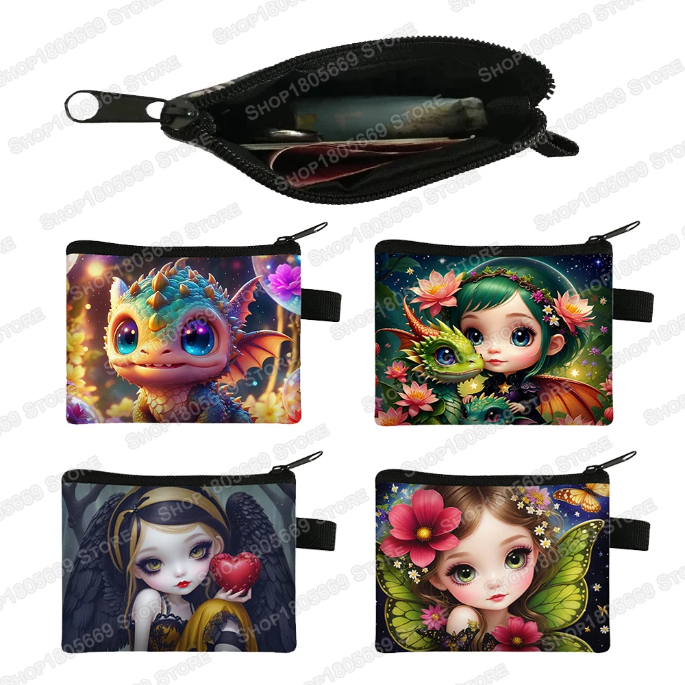 Monedero con estampado de dragón de dibujos animados para niñas, billetera gótica de fantasía, Ángel de hadas, bolsa de dinero, tarjeta de crédito, llavero, lápiz labial, regalo
